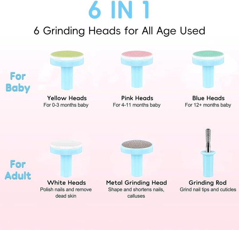 ❤【Baby Nail Clippers 6 in 1】This baby nail file with 6 different grinding heads. This electric nail trimmer is suitable for babies, kids, adults. You can choose a suitable grinding head according to the different growth stages of your baby. Metal grinding heads and rod are suitable for adults to use for manicure. Suitable for all ages.