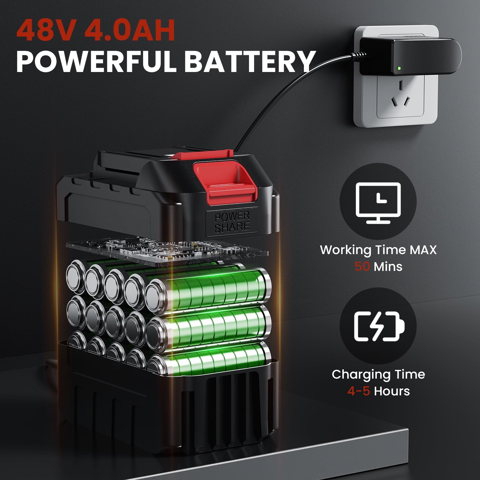 Material: Durable ABS plastic + metal components | Pressure: 1000PSI | Flow Rate: 2.4GPM | Battery: 48V lithium | Hose Length: 32.8ft | Color: Black/Orange accents (variants)