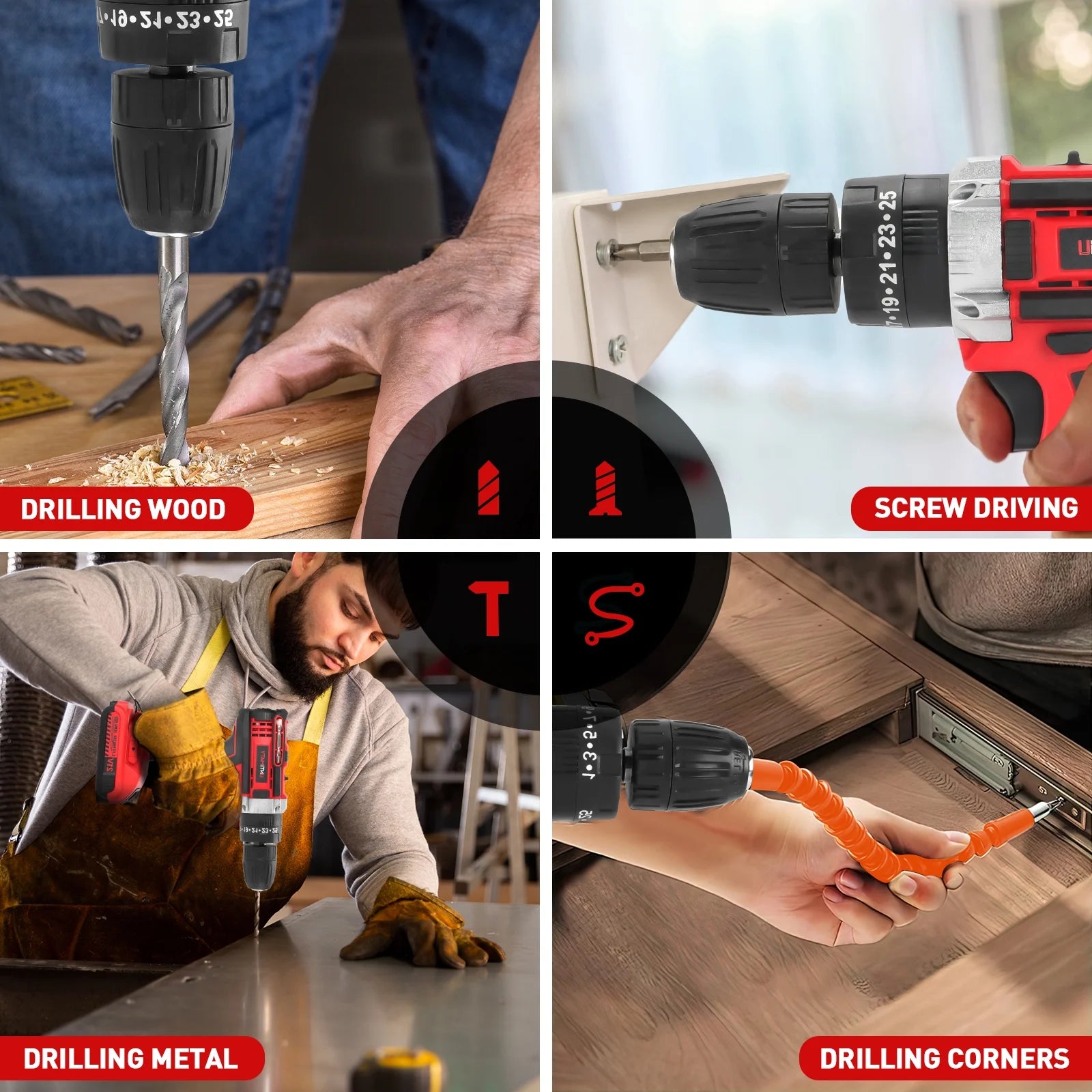David Schneider 21V Cordless Power Drill Set – Drill Driver Kit with 2 Lithium-Ion Batteries, Charger, 3/8" Keyless Chuck & 32pc Bits | Essentials